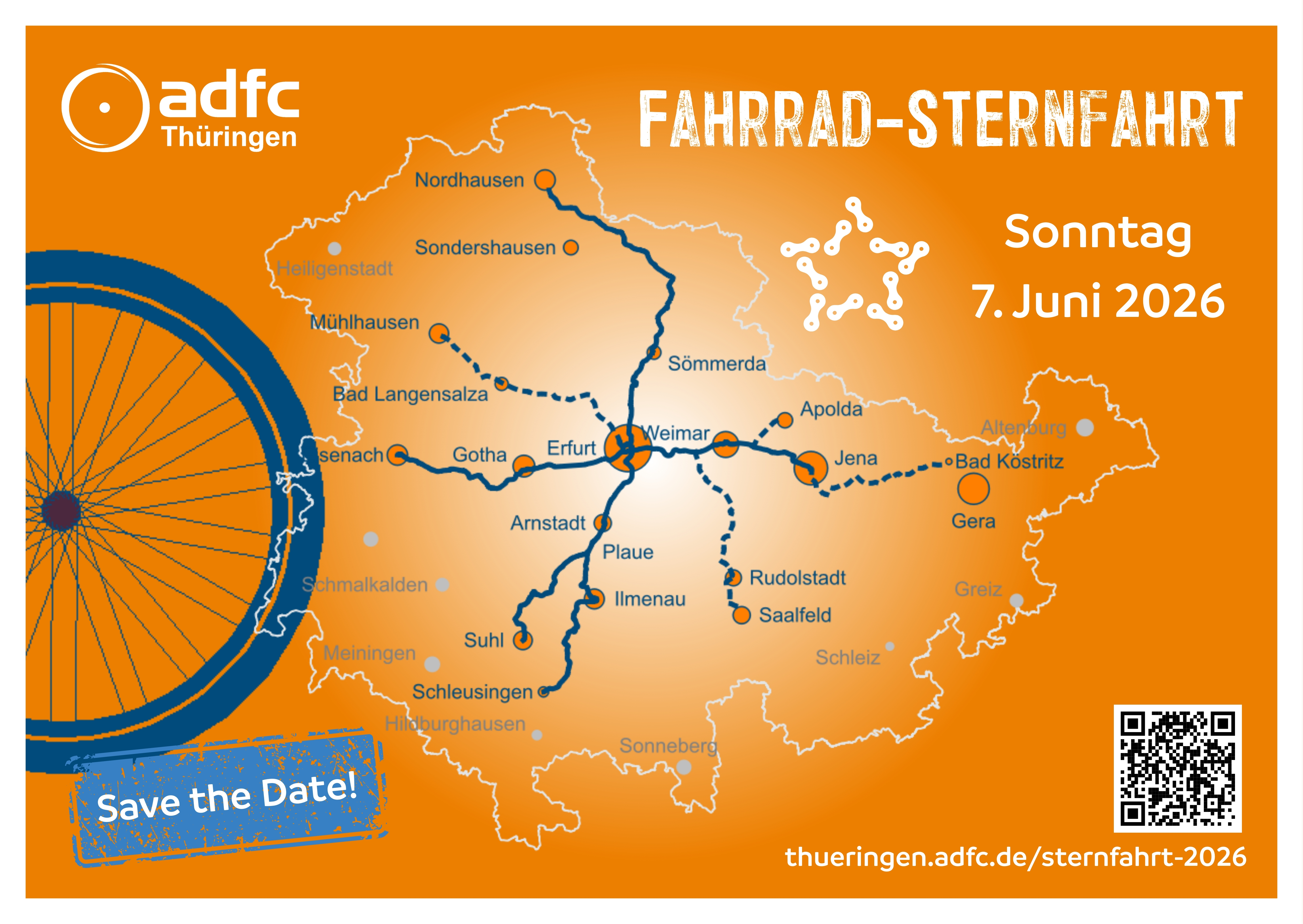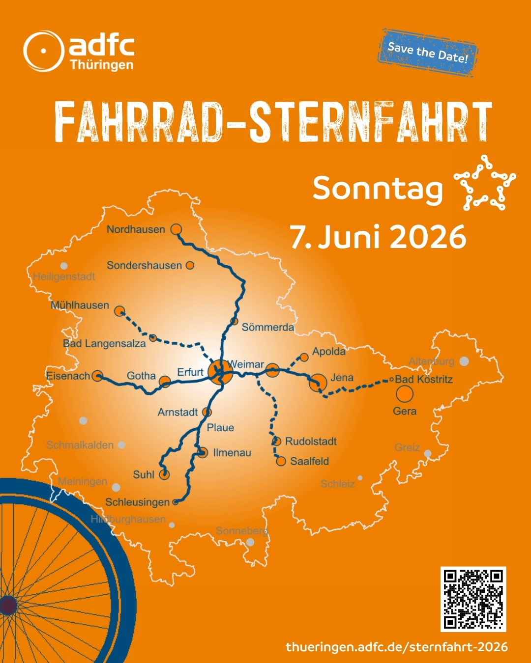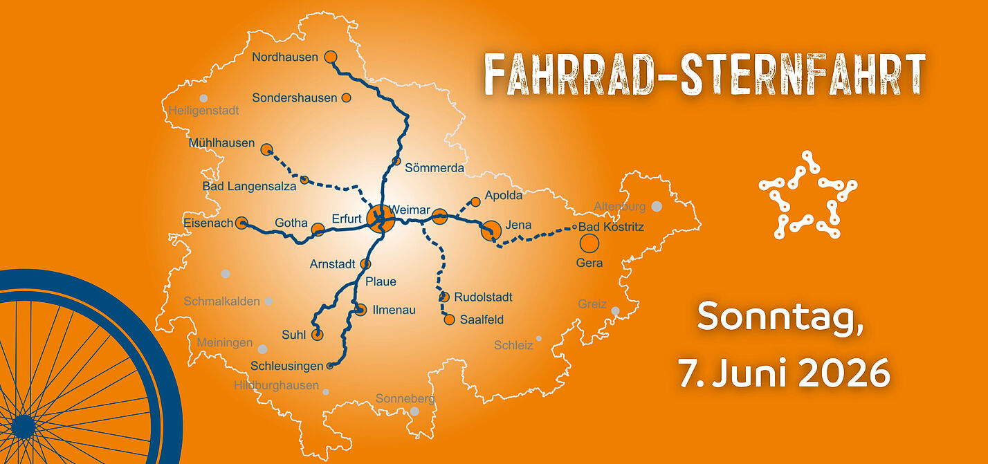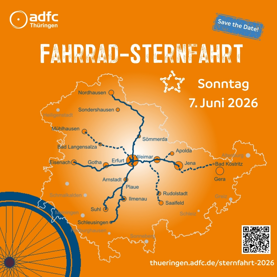 Zum ersten Mal veranstalten wir als ADFC Thüringen am 7. Juni 2026 eine Sternfahrt. Diese soll nicht nur eine unvergessliche Tour werden, sondern auch ein deutliches Zeichen für besseren Radverkehr setzen. Gemeinsam erobern wir die Straßen zurück und zeigen: Radfahren macht Spaß, ist gesund, trägt zur Gestaltung lebenswerter Städte und Regionen bei. Es entlastet den Verkehr und die Kassen von Land, Kommunen und Bürger*innen.