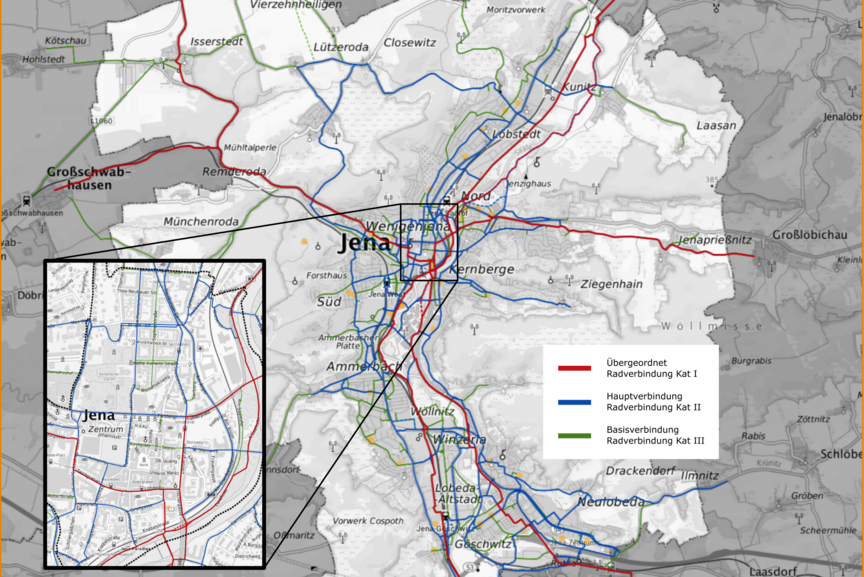 Die Stadt Jena hat das Planungsbüro RV-K mit der Konzeptionierung des Radverkehrsplans beauftragt. Das geplante Radnetz, die Streckenmaßnahmen und Punktmaßnahmen sind hier einsehbar: Link zum WebGIS des Planungsbüros RV-K