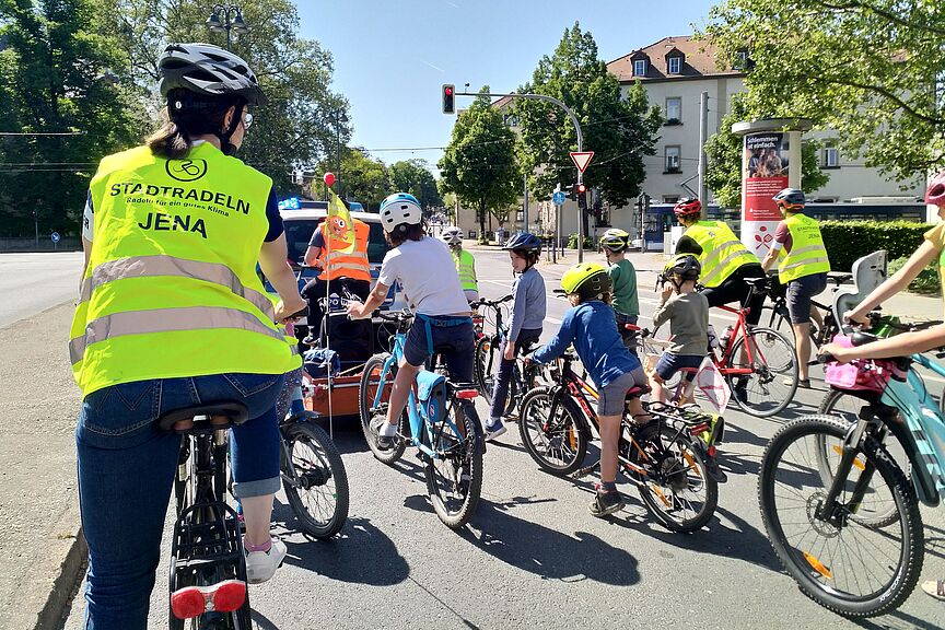 Im Rahmen eines bundesweiten Aktionswochendes fand am Samstag, 14. Mai 2022, auch in Jena eine bunte Familienfahrraddemo "Kidical Mass" für eine stärkere Berücksichtigung der Belange von Kindern im Straßenverkehrsrecht statt.